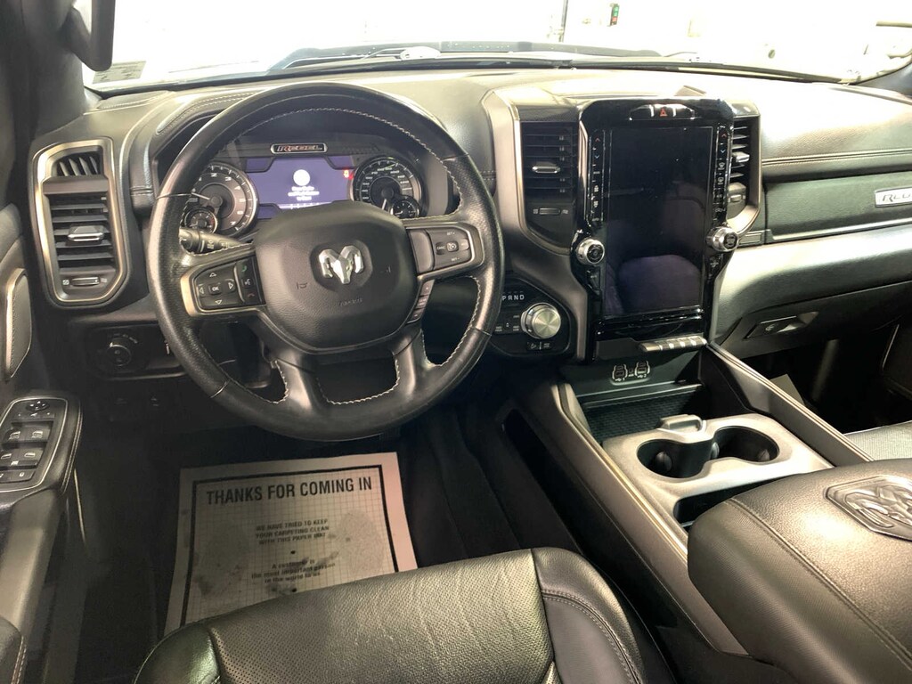 Radio: Uconnect 4 w/8.4 Display, Rear Window Defroster, Rain Sensitive Windshield Wipers, ParkSense Front/Rear Park Assist w/Stop, Power Adjustable Pedals, Rear Dome w/On/Off Switch Lamp, Body Color Door Handles, 115V Auxiliary Rear Power Outlet, Media Hub w/2 Charge Only USBs, Auto Dim Exterior Driver Mirror, Rear Underseat Compartment Storage, Heated Front Seats, Heated Steering Wheel, Foam Bottle Insert (Door Trim Panel), Security Alarm, Black Premium Power Mirrors, Remote Start System, Exterior Mirrors w/Supplemental Signals, Exterior Mirrors Courtesy Lamps, Air Conditioning ATC w/Dual Zone Control, Remote Proximity Keyless Entry, Universal Garage Door Opener, Power-Folding Mirrors, Sun Visors w/Illuminated Vanity Mirrors, harman/kardon® 19 Speaker Premium Sound, Radio: Uconnect 12 w/Navigation, Google Android Auto®, SiriusXM Traffic Plus, USB Host Flip, Disassociated Touchscreen Display, HD Radio, For Details, Visit DriveUconnect.com, Integrated Center Stack Radio, 1-Yr SiriusXM Guardian Trial, 12 Touchscreen Display, GPS Navigation, SiriusXM Travel Link, 4G LTE Wi-Fi Hot Spot, SiriusXM w/360L, Apple CarPlay®, LED Footwell Lighting, Active Noise Control System, Heavy Duty Engine Cooling, Dual Exhaust w/Black Tips, GVWR: 7,100 lbs, HEMI Badge, 220 Amp Alternator, Premium Overhead Console, Dome Dual LED Reading Lamp, Overhead LED Lamps, REMOTE START SYSTEM, TRANSMISSION: 8-SPEED AUTOMATIC (8HP75), Heated Front Seats, Heated Steering Wheel, Power 4-Way Passenger Lumbar Adjust, Power 8-Way Driver & Passenger Seats. Ram Rebel with Granite Crystal Metallic Clearcoat exterior and Black interior features a 8 Cylinder Engine with 305 HP at 6400 RPM*.